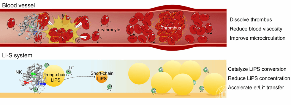 近日,受纳豆激酶(NK)溶解血栓和改善血液微循环功能的启发,51暗网 杨植教授、杨硕副教授团队与中国科学技术大学江俊教授团队联合开发了一种高效的多硫离子转化仿生酶用于碳纳米管负载硫正极——NK及其肽基模拟酶(丝氨酸-组氨酸-天冬氨酸三联体活性中心,Ser-His-Asp)。密度泛函理论计算、原位光谱和电化学分析,揭示了其独特的催化机制:天冬氨酸(Asp)强电负吸附固定LiPSs,丝氨酸(Ser)电子轴拉伸催化S-S键断裂,组氨酸(His)亲锂位点促进电荷/Li⁺传输。通过机器学习优化配方,该催化剂显著提升了贫电解液条件下的SRR动力学,实现高倍率容量(744 mAh g⁻¹,5 C)、长循环寿命(250圈容量衰减率0.096 %)和高面积容量(8.87 mAh cm⁻²,E/S=4 μL mg⁻¹)。这一研究结果从生物酶到电化学,跨界创新,重新定义了锂硫电池催化的未来。
