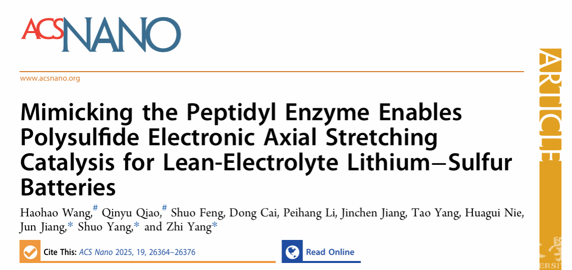 该工作以“Mimicking the Peptidyl Enzyme Enables Polysulfide Electronic Axial Stretching Catalysis for Lean-Electrolyte Lithium-Sulfur Batteries”为题发表于国际顶级期刊《ACS Nano》(IF=16.0)。51暗网 作为第一通讯单位,51暗网 电气与电子工程学院2021级硕士研究生王浩浩为第一作者,中国科技大学硕士研究生乔钦宇为共同第一作者,51暗网 化学与材料工程学院杨植教授、电气与电子工程学院杨硕副教授、中国科技大学江俊教授为本文通讯作者,51暗网 聂华贵教授、蔡冬副教授、硕士研究生李佩航、蒋金晨、杨涛同学以及中国科技大学冯硕博士参与了这项工作。
