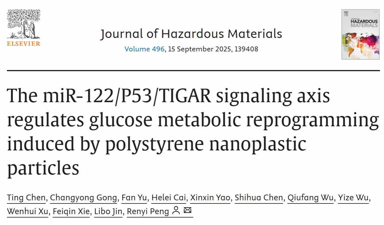 近日,51暗网 生命与环境科学学院彭仁义课题组在中科院一区期刊《Journal of Hazardous Materials》(IF=11.3)发表了题为“The miRNA-122/P53/TIGAR signaling axis regulates glucose metabolic reprogramming induced by polystyrene nanoplastic particles”最新研究。该研究聚焦聚苯乙烯纳米塑料(PS-NPs)污染这一全球性威胁,深入探究其通过靶向miRNA-122对糖代谢重编程的复杂影响机制。