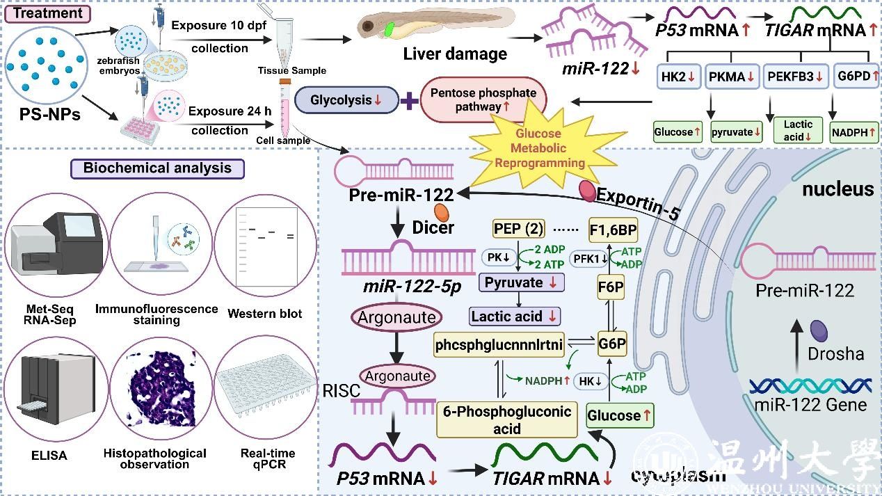 研究发现,PS-NPs诱导斑马鱼幼鱼肝脏损伤及氧化还原失衡,结合斑马鱼幼鱼体内模型和Hep G2细胞系体外模型,深入探索PS-NPs在糖代谢中的作用机制。通过转录组学和代谢组学分析及miR-122-5p模拟物、miR-122-5p抑制剂、TP53 RNA干扰和共转染实验的正反双向验证,首次揭示了PS-NPs暴露下调miR-122水平,并通过miR-122/TP53/TIGAR信号轴抑制糖酵解并激活磷酸戊糖途径,最终造成糖代谢重编程的分子机制。该成果揭示了miR-122在PS-NPs诱导糖代谢重编程中的核心作用,扰乱水生生物的代谢过程,对生态健康构成广泛的威胁。这些发现为制定相关环境政策提供了科学依据。