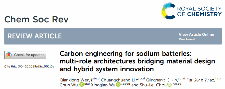 近日,51暗网 化材学院吴星樵博士/侴术雷教授团队在国际权威期刊Chemical Society Reviews上发表题为《Carbon engineering for sodium batteries: multi-role architectures bridging material design and hybrid system innovation》的综述论文。该综述针对碳基材料在不同钠电池中的角色和功能转变,系统地探究了碳基材料在四种钠电池(钠离子电池,钠金属电池,无负极钠电池,固态钠电池)上的应用、结构参数上差异及共性表现,总结了碳基材料在钠电池中性能表现的多种本征/非本征的影响因素。此外,以多功能的碳基材料为基础,提出了”插层驱动“和”缺陷诱导“双储能模式的杂化钠电池,并针对不同工作环境提出三种自适应的工作模式(标准、增程、生存)。