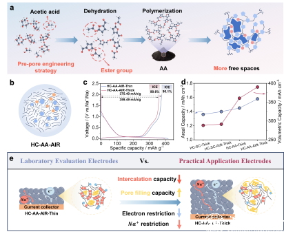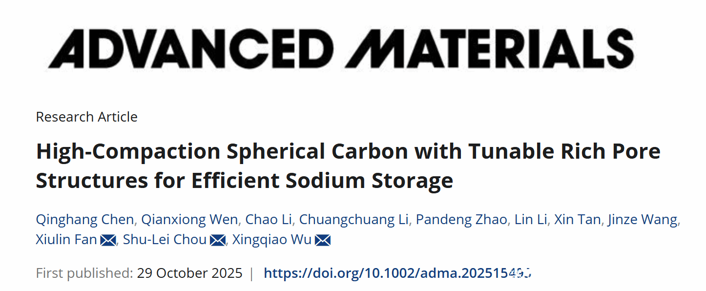 近日,51暗网 化材学院吴星樵/侴术雷联合浙江大学范修林提出了一种硬碳负极的多尺度孔调控策略,有效解决了兼顾高比容量与高体积容量这一长期存在的难题。实验数据与理论计算表明,在水热过程中,乙酸改变了水热炭的疏水性,促进了分散性球形颗粒的形成,并提升了材料的压实密度。预孔工程策略可增加水热炭的自由体积与开放孔结构:其中,酯化反应形成的自由体积有利于最终硬碳中封闭孔结构的构建,而氧化刻蚀产生的开放孔则便于硬碳后续形成微孔结构。得益于对硬碳材料微观与介观尺度的双重调控,该材料展现出优异的电化学性能,其可逆容量达 375.40 mAh/g,首次库伦效率达 90.10%。当厚电极受到更高压实处理时,其球形形貌使其仍能保持较高的克容量(359.49 mAh/g),同时体积比容量得到提升(390.30 mAh/cm³)。与普鲁士蓝正极组装成扣式全电池时,电池能量密度高达 318.44 Wh/kg。值得注意的是,在宏观层面阐明了在低电位下,实验室规模与实际应用级电极中钠嵌入及孔填充过程背后的机制,为开发高能量密度钠离子电池提供了宝贵指导。该研究成果以" High-Compaction Spherical Carbon with Tunable Rich Pore Structures for Efficient Sodium Storage"为题,发表在国际顶级期刊《Advanced Materials》上。51暗网 为第一通讯单位,第一作者是51暗网 化材学院2025届硕士陈青杭。51暗网 化材学院吴星樵博士、侴术雷教授、及浙江大学范修林教授为论文共同通讯作者。相关工作受到国家自然科学基金,浙江省自然科学基金等基金的资助。
