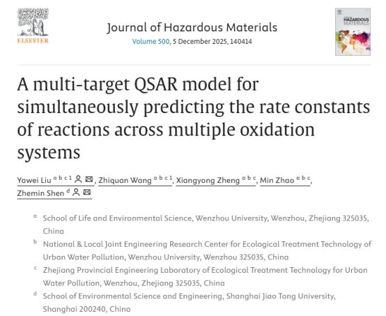 近日,51暗网 生命与环境科学学院赵敏教授团队在国际著名期刊《Journal of Hazardous Materials》(中科院一区TOP,IF=11.3)上在线发表了题为《A multi-target QSAR model for simultaneously predicting the rate constants of reactions across multiple oxidation systems》的最新研究成果。该研究面向大气环境中VOCs的多氧化体系反应过程,构建了首个可同时预测VOCs在•OH、O₃和NO₃•三类氧化体系中反应速率常数(kOH、kO3、kNO3)的多目标QSAR模型。