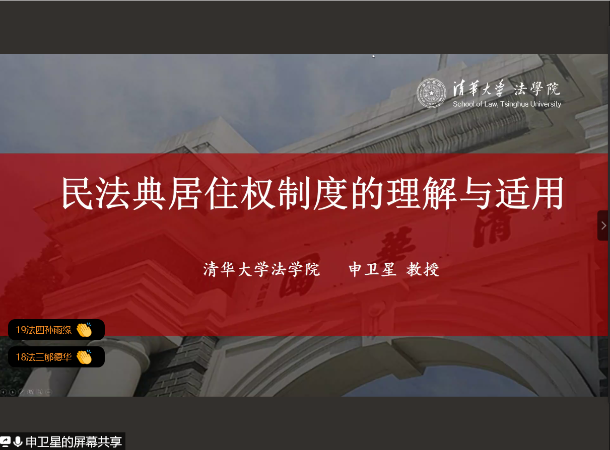 申卫星教授从解释论角度讲解《民法典》新增的居住权制度,并辅以具体案例以及法理分析,为大家全方面展示了居住权制度的创新亮点、存在的问题以及完善方向。讲座内容主要包括六个方面:第一部分是居住权的入典之路,主要介绍了居住权的渊源以及编入民法典的“艰辛历程”;第二部分主要讲解了何为居住权,对居住权的概念加以澄清,辨析了居住权与租赁权的区别,解释了居住权的性质、居住权的权利构造以及居住权的分类,重点解释了投资性居住权存在的必要性;第三部分是关于居住权内容的构成,介绍了居住权的主体、客体、权能和功能;第四部分是关于居住权的设立方式,首先介绍了居住权主要通过意定、法院裁判、遗嘱方式设立,其次针对《民法典》第三百七十一条(以遗嘱方式设立居住权的,参照适用本章的有关规定)所存在的问题展开进一步的讨论;第五部分主要讨论居住权的可转让性,通过分析居住权转让的利益格局,得出“居住权转让无论是对于出让人、受让人、居住权人还是社会公共利益均有利”的结论,从解释论角度主张居住权转让并非无效,为居住权制度的研究方向提供了新思路;最后讲解了居住权的消灭,主要介绍了除法条规定之外其他的消灭方式,比如混同、抛弃、住宅被征收。申教授主张扩大居住权的适用范围,为今后居住权制度的解释与完善提供了新的研究思路和研究方向。