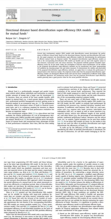 林瑞跃这篇论文主要聚焦证券投资基金的绩效评价问题,基于定向距离函数和分散化数据包络分析(DEA)模型,提出了区分金融市场上有效基金绩效的分散化超效率模型。该模型是可行的,可以处理风险测度、交易成本和收益回报中的负值,所生成的反映基金绩效的超效率值是有界的。在收益分布离散的假设下,通过选择合适的风险和收益测度,可以将该模型转化为线性规划问题。美国市场的实证结果表明,本文提出的分散化超效率模型能够很好地区分有效基金,而有效基金的线性组合可能是低效的。此外,回溯检验结果表明,所提出的有效超效率模型对于实际的投资组合选择具有良好的实践价值。
