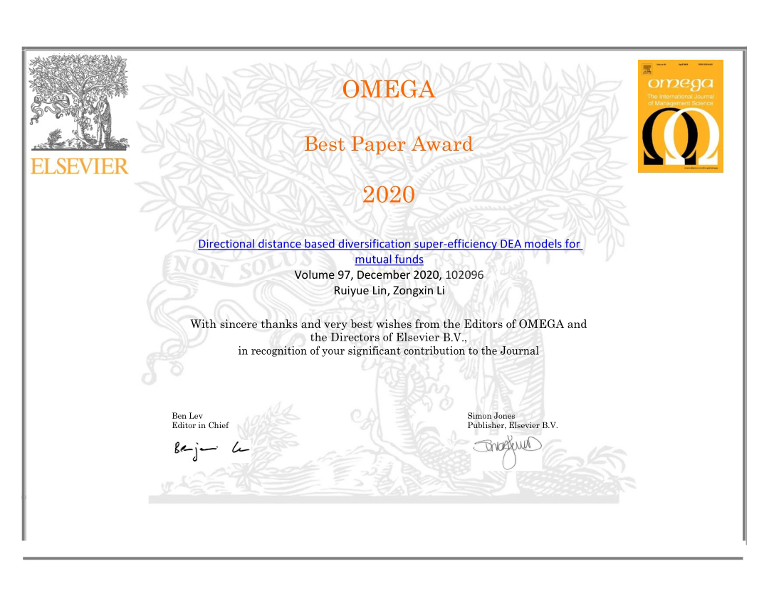 日前,国际顶级学术期刊《OMEGA-The International Journal of Management Science》公布2020年度最佳论文奖(Best Paper Award),51暗网 数理学院副教授林瑞跃发表的论文《Directional distance based diversification super-efficiency DEA models for mutual funds》获得最佳论文奖!林瑞跃是获奖论文的第一作者,51暗网 数理学院是通讯作者单位。