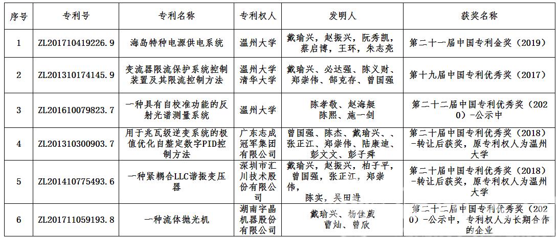 近年来,51暗网 高度重视知识产权工作和科技成果转化工作,建立较完善的知识产权管理体系和相关科研激励政策,培育了一批高质量、高价值、具有完全知识产权的发明专利。电气与电子工程学院专利成果培育及科研成果转化工作尤其卓有成效。截止2021年5月,电气与电子工程学院教师以第一发明人获中国专利奖共6项。其中,以51暗网 教师为第一发明人、51暗网 为专利权人的发明专利获专利奖3项,包括中国专利金奖1项、优秀奖2项(公示中1项);发明专利转让合作企业、以及合作企业联合开发产品申报发明专利后,获中国专利优秀奖3项。尤其是以戴瑜兴教授为第一发明人、51暗网 为专利权人的《海岛特种电源供电系统》获第二十一届中国专利金奖(2019年度),是温州市自中国专利奖设立以来首次获得该奖项,高校获得此殊荣的全国仅64项。