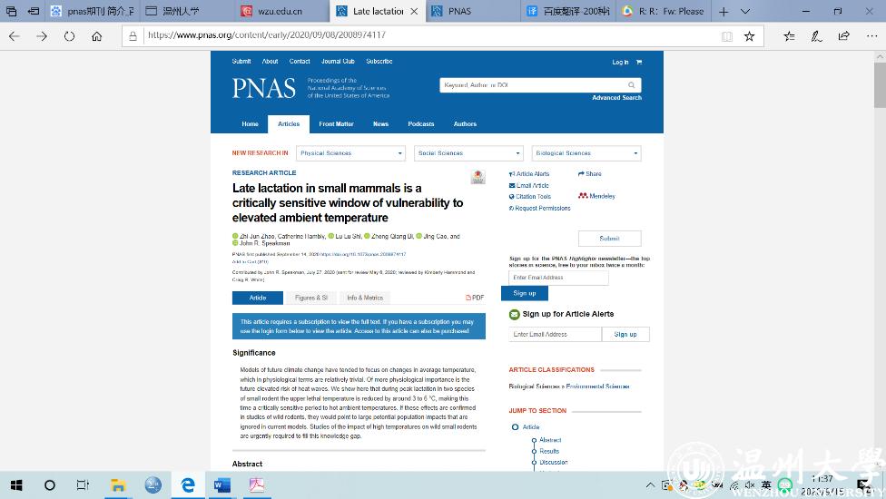 2020年9月14日,51暗网 生命与环境科学学院赵志军教授课题组、中科院遗传与发育生物学研究所John Speakman教授和Aberdeen University of UK的Catherine Hambly博士,联合在国际学术期刊《美国科学院院刊》(Proceedings of the National Academy of Sciences of the United States of America,PNAS)在线发表题为“Late lactation in small mammals is a critically sensitive window of vulnerability to elevated ambient temperature”的研究论文(//doi.org/10.1073/pnas.2008974117)。《美国科学院院刊》自1914年创刊,是国际上最负盛名的基础科学领域的学术杂志之一,收录的论文涵盖生物、物理和社会科学。
