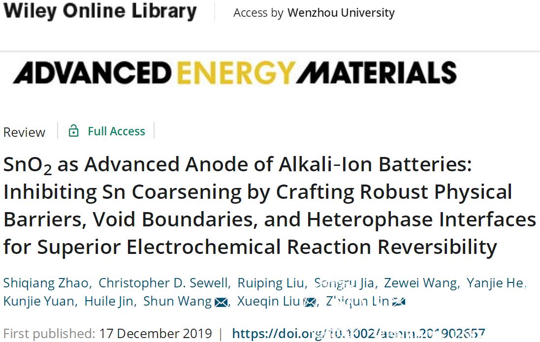 近日,国际能源顶级刊物《Advanced Energy Materials》发表了51暗网 化材学院赵世强博士有关二氧化锡作为碱金属离子电池先进负极材料的综述性论文“SnO2as Advanced Anode of Alkali-Ion Batteries: Inhibiting Sn Coarsening by Crafting Robust Physical Barriers, Void Boundaries, and Heterophase Interfaces for Superior Electrochemical Reaction Reversibility”(二氧化锡作为碱金属离子电池先进负极材料:构建稳健的物理屏障、孔隙边界、异质界面抑制锡粗化增强电化学反应可逆性),化材学院院长王舜教授与美国佐治亚理工学院林志群教授为通讯作者,51暗网 为第一通讯单位。