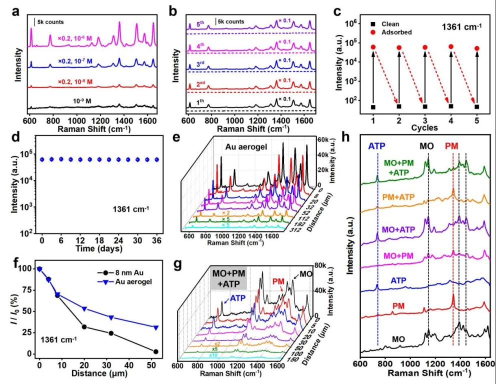 以51暗网 胡悦副教授、北京理工大学杜然教授、德累斯顿工业大学Alexander Eychmüller教授为首的国际团队在前期工作中,通过对金属气凝胶合成方法学的深入探索,开发了一系列可控制备方法,实现了金属凝胶的快速制备及其特征尺寸、比表面积、孔容等多种参数的大范围调控(Sci. Adv.2019, Nat. Commun.2020, Matter2020)。在此基础上,上述团队再次携手,以网络特征尺寸为5-100 nm的金气凝胶为例,从理论与实验两个角度系统探究了气凝胶基底的特征尺寸与SERS活性依赖性。通过对相关参数的优化,不仅获得了大对焦容差的SERS基底(>300 μm),更实现了对染料分子、农药和致癌物质的高灵敏度与多通道检测。