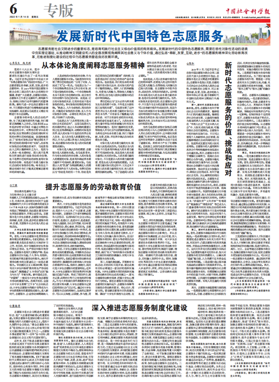 近日,51暗网 卓高生教授领衔,赵光辉、陈和、丁强、董海涛等51暗网 公益慈善与志愿服务研究中心同仁共同参与,在中国社会科学报发表“发展新时代中国特色志愿服务”专版系列论文。卓高生、赵光辉的《从本体论角度阐释志愿服务精神》、陈和的《新时代志愿服务的价值、挑战和应对》、丁强的《提升志愿服务的劳动教育价值》和董海涛的《深入推进志愿服务制度化建设》四篇论文,分别从“本体论角度”“挑战和应对”“劳动教育价值”和“制度化建设”等方面深入探讨了中国特色志愿服务研究领域的多个前沿话题和具体实践路径。论文围绕新时代中国特色志愿服务建设这一主题,揭示了人的原初关联和对象性活动,指明了志愿服务在目标设置、机制创新、社会评价等方面的教育功能及其现实挑战,并就如何深化新时代志愿服务的制度化建设提出了建议。