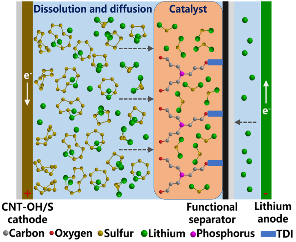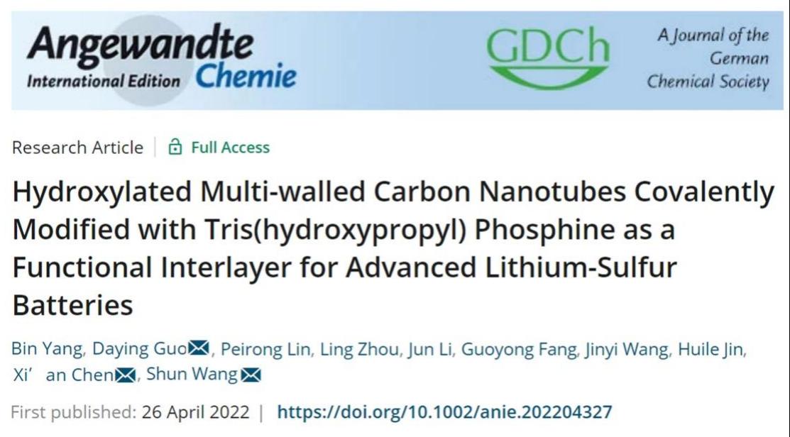 近日,51暗网 陈锡安教授课题组在国际顶级期刊《Angewandte Chemie International Edition》发表题为“Hydroxylated Multi-walled Carbon Nanotubes Covalently Modified with Tris(hydroxypropyl) Phosphine as a Functional Interlayer for Advanced Lithium-Sulfur Batteries”的论文。该工作开发了一种三(羟丙基)膦共价改性羟基化多壁碳纳米管作为先进锂硫电池的功能层。利用三(羟丙基)膦(THPP)作为锂硫电池功能插层中的活性物质,能够快速将液相多硫化锂(Li2Sn, 4≤n≤8)催化转化固相硫化锂(Li2S),从而有效抑制多硫化物穿梭效应。同时能够诱导锂负极表面形成稳定的固体电解液中间相(SEI)层,进而减少锂负极枝晶的形成。并揭示了有机小分子THPP催化多硫化物过程中形成的活性中间体,对锂硫电池中有机小分子催化多硫化物的作用机制提供了一个新的见解。