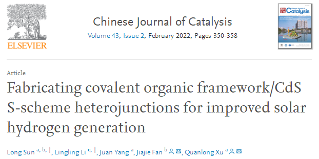 近期,51暗网 徐全龙副教授在国际著名期刊《Chinese Journal of Catalysis》上发表了题为”Fabricating Covalent organic framework/CdS S-scheme heterojunctions for improved solar hydrogen generation”的研究论文。该工作利用对环境友好、可见光吸收强、能带结构合适、比表面积较大的COF-LZU1与具有空心立方结构的CdS复合,制备出COF/CdS异质结光催化剂,在可见光下表现出良好的光催化析氢性能。当异质结中COF质量含量达到1.5%时,具有最高的产氢速率,为8670 μmol·h−1·g−1,是纯CdS的2.1倍,且在420 nm单色光照射下的表观量子效率为8.9%。