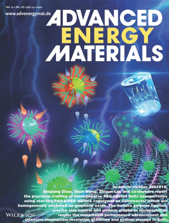 近日,《Advanced Energy Materials》(影响因子:29.698)将51暗网 赵世强副教授第一作者的研究论文“Advancing Performance and Unfolding Mechanism of Lithium and Sodium Storage in SnO2 via Precision Synthesis of Monodisperse PEG-Ligated Nanoparticles”选为期刊封面文章。51暗网 王舜副校长与佐治亚理工学院林志群教授为通讯作者。该研究工作受到国家自然科学基金项目(21905208)的资助。
