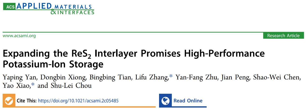 然而,目前报道的ReS2电极材料表现出的较差的动力学离子扩散和循环稳定性,尤其是在高电流密度下的电化学性能。为了解决上述关键核心问题,近日,51暗网 化材学院碳中和技术创新研究院肖遥团队在国际权威期刊《ACS Applied Materials & Interfaces》(//pubs.acs.org/doi/abs/10.1021/acsami.2c05485)上发表题为“Expanding the ReS2 Interlayer Promises High-Performance Potassium-ion Storage”的研究论文。本文利用二维层状材料的特点,采用二维材料层间距扩大的策略,通过简单的水热法,在还原氧化石墨烯(rGO)表面上合成了扩层的ReS2纳米片。所制备的ReS2纳米片的层间距为~ 0.77 nm,远大于扩层前的0.61 nm。采用原位XRD技术研究了ReS2在钾离子电池中的离子存储机制,揭示了钾离子在扩层ReS2中嵌入和转换两种混合的模式。扩层的纳米复合材料在0.05、0.2和1.0 A/g电流密度下表现出432.5、316.5和241 mAh/g的高比容量,并在1A/g的电流密度下,表现出优异的可逆性。总体而言,这种材料局域化学策略也为其他材料的开发应用提供了新的借鉴。