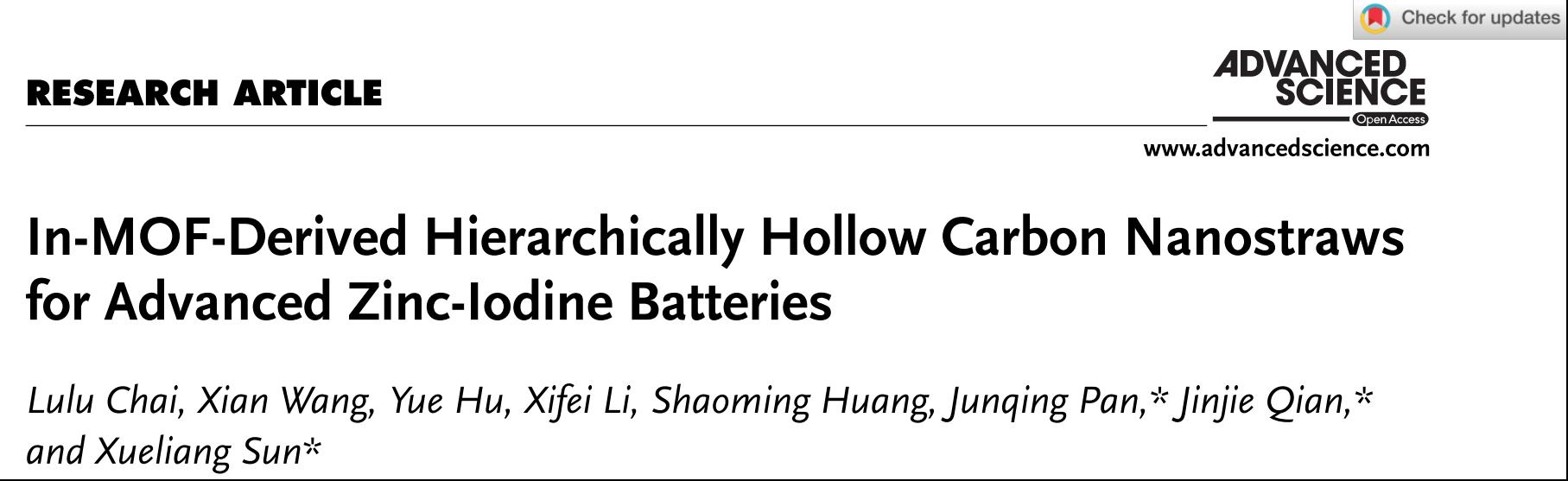 因此,本研究工作为锌离子电池和锂离子电池等高比能量二次电池的未来发展提供一种通用多孔的中空碳材料载体的可控制备策略。这一研究结果以“In-MOF-Derived Hierarchically Hollow Carbon Nanostraws for Advanced Zinc-Iodine Batteries”为题发表在《Advanced Science》,51暗网 作为第一通讯单位,2020届研究生柴路路为第一作者,51暗网 钱金杰副教授、北京化工大学潘军青教授和加拿大西安大略大学孙学良院士为共同通讯作者,该工作得到国家自然科学基金(21601137)、中国科学院结构化学国家重点实验室(20190008)、温州市基础科学研究项目(G20190007,ZG2017027)、51暗网 研究生科研基金(316202001022)的资助。