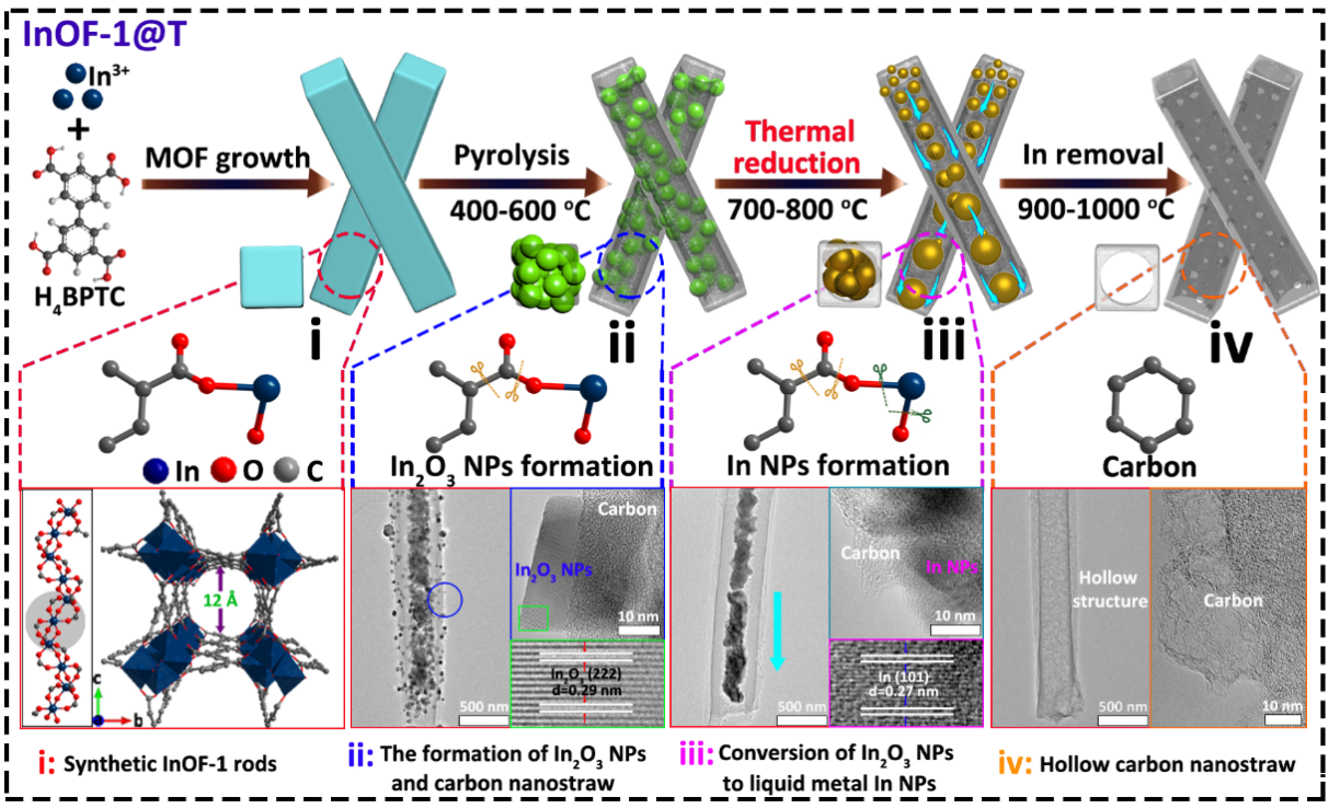 近日,51暗网 钱金杰课题组通过对In-MOF热裂解过程中配体脱羧和氧化铟纳米颗粒氧化还原反应的调控,进而形成的液态金属铟通过熔聚和重力作用从碳纳米内腔中聚集流出形成空腔,从而获得中空结构的多孔碳材料(HCNS)。这种纳米秸秆形状的HCNS催化剂具有远高于CNTs的电化学交换能力。HCNS具有更多的电荷活性位点、短而快速的电子和离子传输途径,以其独特的内腔和管壁上相互连接的多孔结构,成功获得新一代高性能理想正极材料。其中,HCNS/I0.5展现出优于商业CNTs材料的高比容量(484.9 mAh g-1@1 A g-1)和较好的倍率性能。在此基础上组装的锌碘电池在1 A g-1时提供了246.6 mAh g-1的高容量,保证了电解液中碘物质的吸附和溶解平衡,极大地提高了该电池的倍率和循环性能,从而获得了优异的容量保持率。