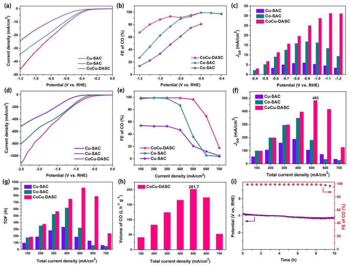 合成得到的CoCu双原子催化剂,在H型和流动型电解池中均表现出优秀的催化活性。在流动型电解池中,CO选择性最高可达99.1%。CO部分电流密度最高可达483 mA cm-2。在100 mA cm-2 ~ 500 mA cm-2的宽电流区间内,CO选择性均在90%以上。经过十小时的稳定性测试后,CO选择性仍能保持在95.6%以上。理论计算表明,跟Co/Cu SACs相比,CoCu双原子催化剂不仅可以促进*COOH的形成,还可以增强*CO的脱附,从而加快反应速率,表现出更优异的CO2电还原活性。该工作表明,在单原子催化剂中合理引入另一种金属原子,可以显著影响其电子结构,进而提高催化活性。本研究为设计实用、稳定、高性能的异核双原子催化剂提供了一种有效策略。