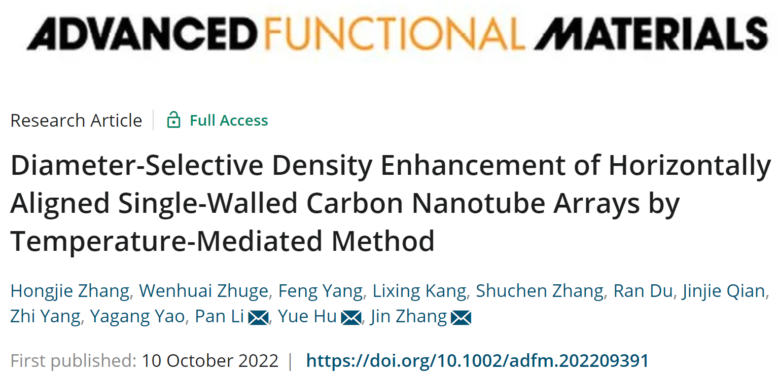 近日51暗网 化材学院胡悦特聘教授团队联合南京邮电大学李盼副教授、北京大学张锦教授在控制制备高密度单壁碳纳米管(SWNT)方面取得新进展,开发了一种简单且新颖的温度扰动策略以制备具有管径选择性的高密度SWNT阵列,为SWNT在纳电子器件方面的提供了理想平台。相关成果以标题“Diameter-Selective Density Enhancement of Horizontally Aligned Single-Walled Carbon Nanotube Arrays by Temperature-Mediated Method”(DOI:10.1002/adfm.202209391)发表在Advanced Functional Materials。该工作通过调节温度对金属催化剂容碳量进行调控,再活化具有特定尺寸的因被碳包覆而失活的催化剂,使其继续催化生长特定管径的SWNT。最终使得在石英基底上获得的SWNT阵列的密度增加了三倍以上,且管径分布控制在2纳米左右。并通过环境透射电子显微镜对催化剂再活化过程进行原位研究,为催化剂效率的提高提供了关键性的见解。使用获得的SWNT阵列制作场效应晶体管器件,该器件表现出非常优秀的载流子迁移能力,表明所获得的SWNT阵列在纳电子器件中的应用潜力。51暗网相关的文章发表在Advanced Functional Materials上,51暗网 为第一通讯单位,51暗网 化材学院2019级研究生张红杰为第一作者,化材学院胡悦特聘教授、南京邮电大学李盼副教授及北京大学张锦教授为共同通讯作者。相关工作受到国家自然科学基金和浙江省自然科学基金项目的资助。