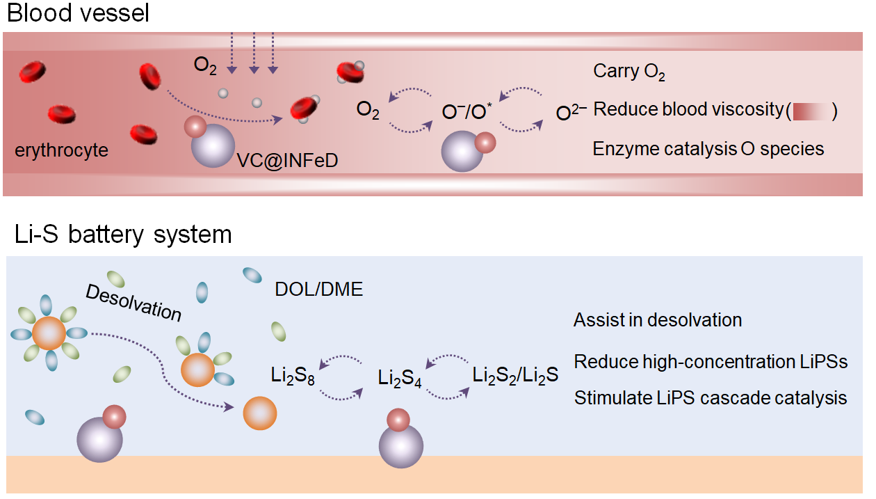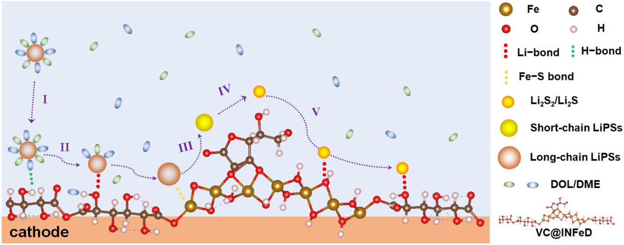 在此,受右旋糖酐铁(INFeD)和抗坏血酸(VC)联合作为治疗贫血的补血药启发,51暗网 杨植教授、蔡冬博士与杨硕博士联合开发了一种高效的VC@INFeD硫正极催化剂,在多重H/Li键的协助下,溶剂化的多硫化锂(LiPSs)在正极/电解质界面上可通过具有梯度吸附能力的羟基基团完成富集和脱溶化,随后在INFeD链上完成转移,进而在VC@INFeD级联催化位点实现其彻底转化。结果表明,INFeD主要促进长链LiPSs的转化,VC加速短链LiPSs的转化,两者协同可以显著降低每个硫氧化还原步骤的能量势垒,并赋予锂硫电池优异的电化学性能。即使在高硫含量(5.2 mg cm‒1)和贫电解质(E/S,~7μL mg−1)条件下,也具有高硫利用率和良好的循环稳定性。