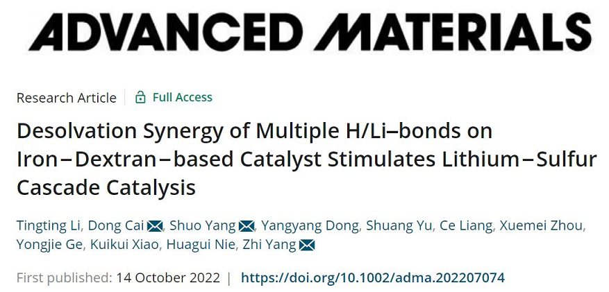 因此,本研究以“Desolvation Synergy of Multiple H/Li–bonds on Iron−Dextran−based Catalyst Stimulates Lithium−Sulfur Cascade Catalysis”为题发表在材料领域顶级期刊《Advanced Materials》。51暗网 作为第一通讯单位,2020级研究生李婷婷为第一作者,51暗网 化学与材料工程学院杨植教授、蔡冬博士和电气与电子工程学院杨硕博士为共同通讯作者,51暗网 聂华贵教授、葛勇杰博士、肖逵逵博士、周学梅博士、硕士生梁策、于爽同学以及首届博士生东洋洋同学参与了这项工作。该工作得到国家自然科学基金、浙江省自然科学基金的部分资助。