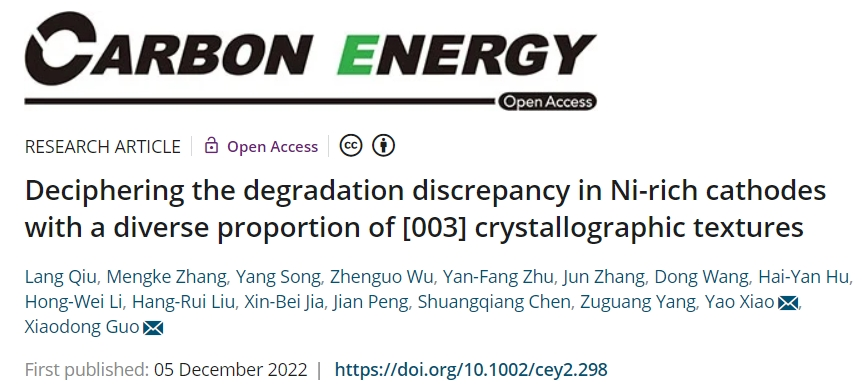 该成果以“Deciphering the degradation discrepancy in Ni-rich cathodes with the diverse proportion of [003] crystallographic texture”为题发表在高水平期刊Carbon Energy(IF: 21.556)上。51暗网 化材学院肖遥教授与四川大学郭孝东教授为该论文共同通讯作者。