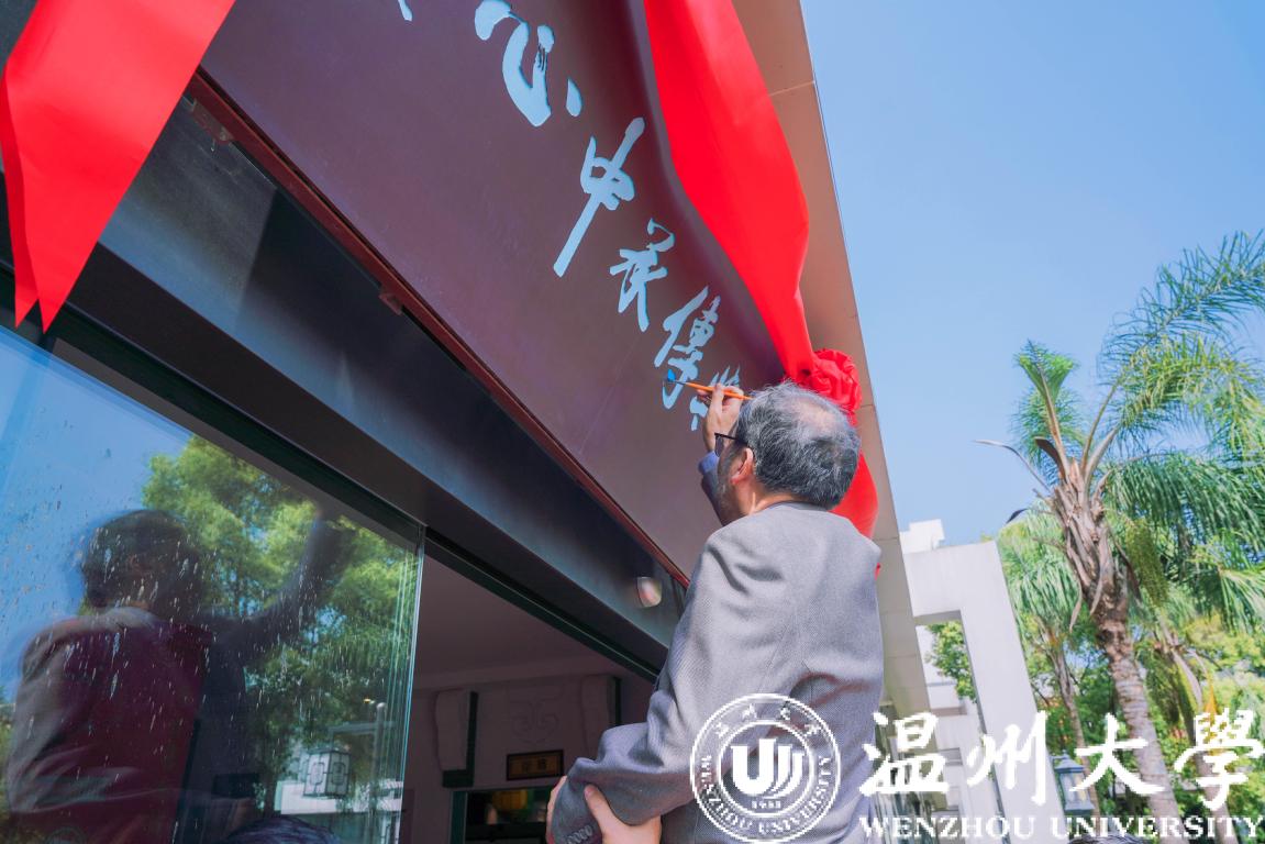 中国古代戏曲学会会长、上海戏剧学院资深教授叶长海教授为浙江传统戏曲研究与传承中心牌匾点彩。