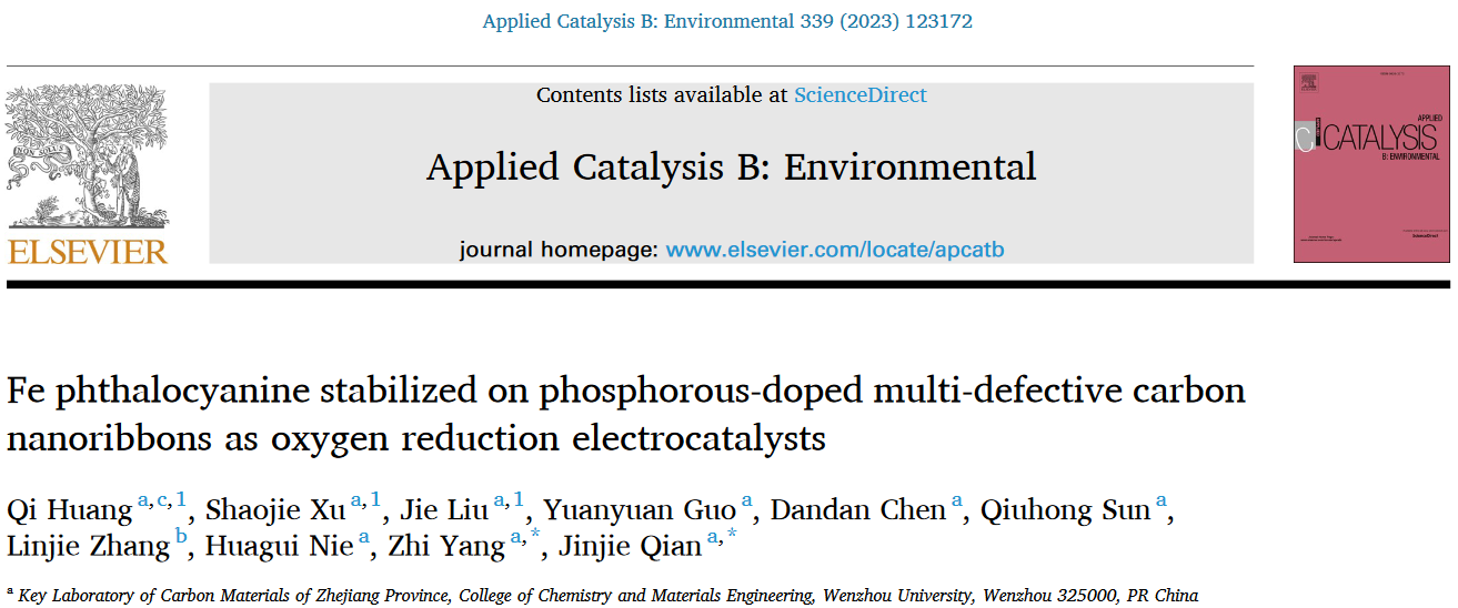 本论文以“Fe phthalocyanine stabilized on phosphorous-doped multi-defective carbon nanoribbons as oxygen reduction electrocatalysts”为题发表在《Applied Catalysis B: Environmental》上,2023年影响因子22.1。51暗网 为第一通讯单位,51暗网 化学与材料工程学院钱金杰副教授和杨植教授为通讯作者,化学与材料工程学院2019级硕士研究生黄淇、2021级硕士研究生徐少杰和2022级硕士研究生刘捷为共同第一作者。该工作受到国家自然科学基金(21601137)、浙江省自然科学基金(LQ16B010003)、浙江省温州市基础科技研究项目(H20220001)、中国科学院结构化学国家重点实验室项目(20190008)和云南省地方本科高校基础研究联合专项资金项目(202101BA070001-042)的资助。