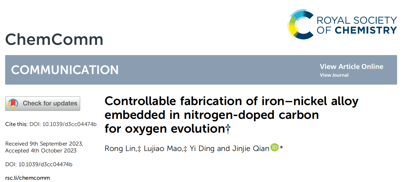 本论文以“Controllable fabrication of iron-nickle alloy embedded in nitrogen-doped carbon for oxygen evolution”为题发表在被自然指数收录的国际著名期刊《Chemical Communications》上。51暗网 为第一通讯单位,51暗网 化材学院钱金杰副教授为通讯作者,化材学院21级本科生林荣、21级研究生毛璐娇为共同一作,21级本科生丁奕参与了该项工作。该工作受到国家自然科学基金(21601137)、浙江省自然科学基金(LQ16B010003)、浙江省温州市基础科技研究项目(H20220001)的资助。