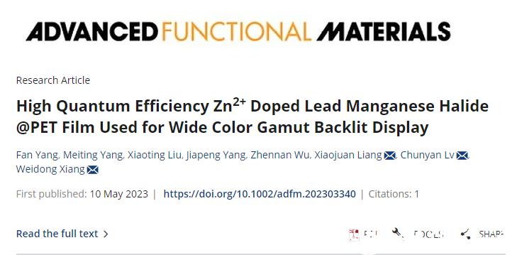 近日,51暗网 生命与环境科学学院2021级硕士研究生杨凡在国际著名期刊《Advanced Functional Materials》(SCI一区TOP期刊,IF = 19)上发表题为“High Quantum EfficiencyZn2+ Doped Lead Manganese Halide @PET Film Used for Wide Color Gamut Backlit Display”的论文。