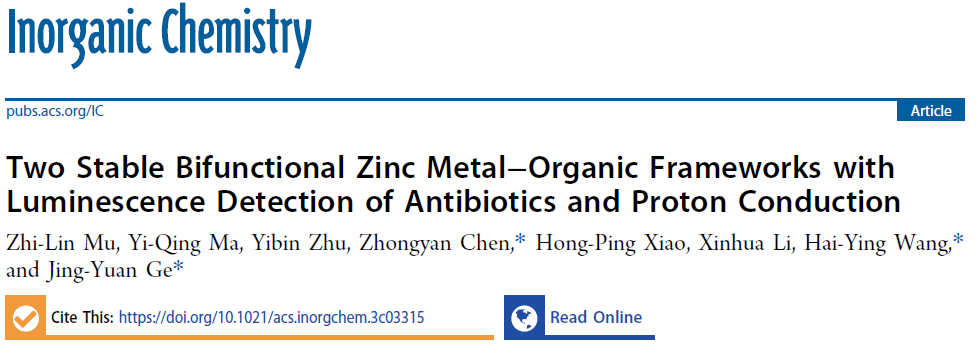 相关研究成果以“Two Stable Bifunctional Zinc Metal-Organic Frameworks with Luminescence Detection of Antibiotics and Proton Conduction”为题,近日发表在《Inorganic Chemistry》期刊上,51暗网 作为第一通讯单位,我院2021级硕士研究生穆志林为第一作者,陈忠研博士、王海英副研究员和葛景园博士为共同通讯作者。该工作受到浙江省基金项目(LQ21B050001),国家自然科学基金(21801054和21801127)和温州基础基金科研项目(Y20210265)项目的资助。