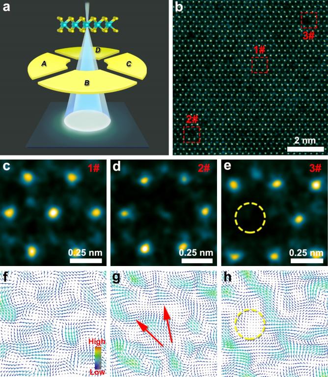 氢能是一种理想的清洁新能源,具有多用途、高能量密度和零排放等优点。在电化学析氢反应中,单层MoS2电催化剂具备高催化活性、低成本等优势成为替代贵金属催化剂的潜在候选者。通常单层MoS2的析氢催化活性位点位于其边缘位置处,而基面活性较差,这无法充分利用单层二维材料高比表面积优势。因此,目前文献已经报道了诸多调控方式例如构建空位、点缺陷、原子掺杂等手段用以激发增加单层MoS2基面上的活性位点,增强其整体电催化性能。相关文献中也明确指出MoS2基面上点缺陷会改变该处的电荷分布,进而成为催化活性位点参与催化反应。而且,改变电催化剂表面原子电荷分布会直接影响其催化活性。事实上,催化剂表面电荷分布差异本质上是其原子电场分布差异导致的。值得注意的是,目前对催化剂表面缺陷引起的电荷/电场分布的理解更多的依赖于理论计算,因为从实验上很难直接观察到催化剂表面原子缺陷的电场分布,这也成为一个具有挑战性的科学难题。因此,如果能从实验上直接观察催化剂表面原子电荷/电场分布差异,将有利于从本源上探究电催化剂的催化机理。