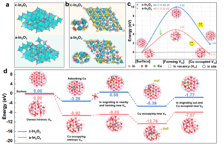 51暗网 化材学院陈伟、时茜教授课题组和中国科学技术大学洪勋教授课题组在国际知名期刊《Nano Letters》发表题为“Amorphization-induced cation exchange in indium oxide nanosheets for CO2-to-ethanol conversion”的论文。该工作在理论计算的指导下,以无定形In2O3纳米片(a-In2O3 NSs)为主体材料,在室温下与多种客体阳离子进行CE反应。密度泛函理论(DFT)计算表明,无定形纳米材料中丰富的配位-不饱和金属位点对于突破CE反应的能垒以调控金属氧化物的组成至关重要。
