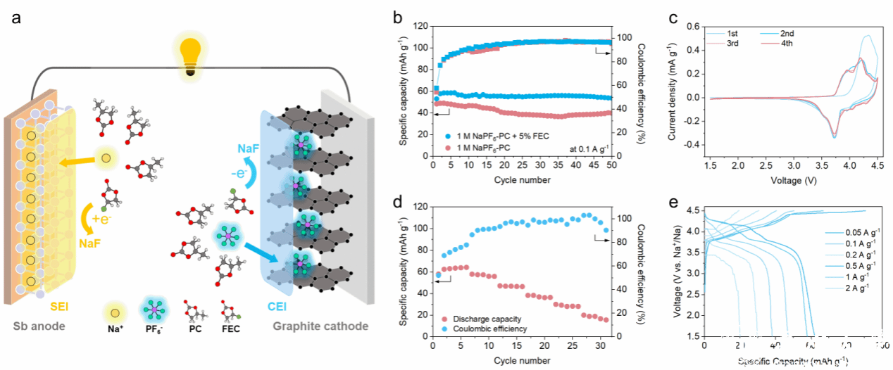 近日51暗网 化材学院碳中和技术创新研究院李林团队联合南开大学赵庆教授以及澳大利亚伍仑贡大学赖伟鸿教授在国际权威期刊《Angewandte Chemie International Edition》上发表题为《Insight into the Role of Fluoroethylene Carbonate on the Stability of Sb||Graphite Dual-Ion Batteries in Propylene Carbonate-Based Electrolyte》的学术论文。本论文以锑(Sb)和石墨分别作为阳极和阴极,研究了含有氟代碳酸乙烯酯(FEC)添加剂的电解液中Na- DIBs的电化学性能。与不含FEC的电解液(1 M NaPF6-碳酸丙烯酯(PC))相比,作者发现加入FEC添加剂(5 wt.%)可促进阴极和阳极上富含NaF的无机电极电解质界面的形成,并改变PF6-阴离子的溶剂化行为。这种改性不仅有效抑制了NaPF6盐和PC溶剂的过度分解,还促进了PF6-阴离子在石墨阴极中的插层。制备的Sb||石墨全电池在50次循环后达到了58.5 mAh g-1的高放电比容量,容量保留率为93.1%(而传统电解质分别为48.3 mAh g-1和79.7%)。此外,在功率密度为157.78 W kg-1时,电池的能量密度为194.95 Wh kg-1(基于正极和负极的活性材料的质量)。本工作阐明了双功能FEC的潜在机制,并为构建高性能双离子电池提供了一种替代策略,促进了他们在未来可持续储能系统中的实际应用。
