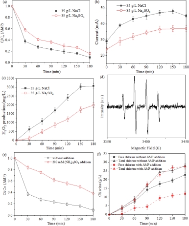 图 3 中间脱盐室中盐水类型(NaCl 或 Na2SO4)对耦合工艺性能的影响:(a)AMP去除率,(b)电流输出和(c)H2O2产生量。(d) DMPO-•OH的EPR谱图。(e) 淬灭实验。(f) 总氯和游离氯的浓度。反应条件:[AMP]0 = 200 mg/L,[盐水]0 = 35 g/L,电压 = 4 V。