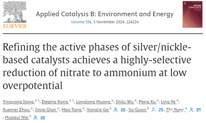 相关研究成果以《Refining the Active Phases of Silver/Nickle-based Catalysts Achieves a Highly-Selective Reduction of Nitrate to Ammonium at Low Overpotential》为题发表在《Applied Catalysis B-Environmental》(IF:22.1)上。51暗网 2021级研究生江颍洋和2022级研究生孔德清为第一作者,我院杨植教授、聂华贵教授、葛勇杰副研究员和贯佳副教授为共同通讯作者。