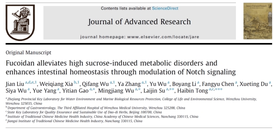 近日,51暗网 生环学院佟海滨课题组揭示褐藻活性成分Fucoidan(岩藻聚糖硫酸酯)通过重塑肠道干细胞增殖与分化稳态改善代谢异常的分子机制,该研究成果Fucoidan alleviates high sucrose-induced metabolic disorders and enhances intestinal homeostasis through modulation of Notch signaling发表在《Journal of Advanced Research》(综合性期刊,1区Top,影响因子11.4)。