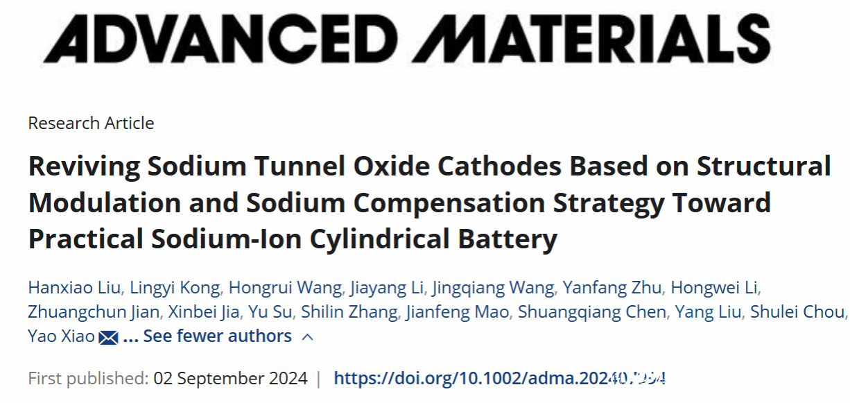 该成果以“Reviving Sodium Tunnel Oxide Cathodes Based on Structural Modulation and Sodium Compensation Strategy Towards Practical Sodium-ion Cylindrical Battery”为题,发表在《Advanced Materials》上,51暗网 为第一通讯单位,我院硕士研究生刘含笑和孔令益为共同第一作者。