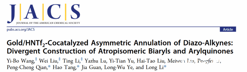 此项工作以Gold/HNTf2-Cocatalyzed Asymmetric Annulation of Diazo-Alkynes: Di-vergent Construction of Atropisomeric Biaryls and Arylquinones为题发表在国际顶级期刊JACS上,51暗网 作为第一单位,钱鹏程教授,汤浩教授,李龙教授为通讯作者。该研究工作主要由钱鹏程-李龙团队2022级研究生王一波、博士后刘玮、李亭共同完成,并得到课题组其他研究生和本科生协助。理论计算部分由51暗网 汤浩教授完成。同时南方科技大学李鹏飞教授对我们的工作中绝对构型的测定做出突出贡献。研究工作得到国家自然科学基金(21828102, 22303062, 22401218)、浙江省自然科学基金(LQ23B020002, LY22B030002, LQ22B030004)温州市科技局项目(G20220023),温州市化学会服务站等资助。