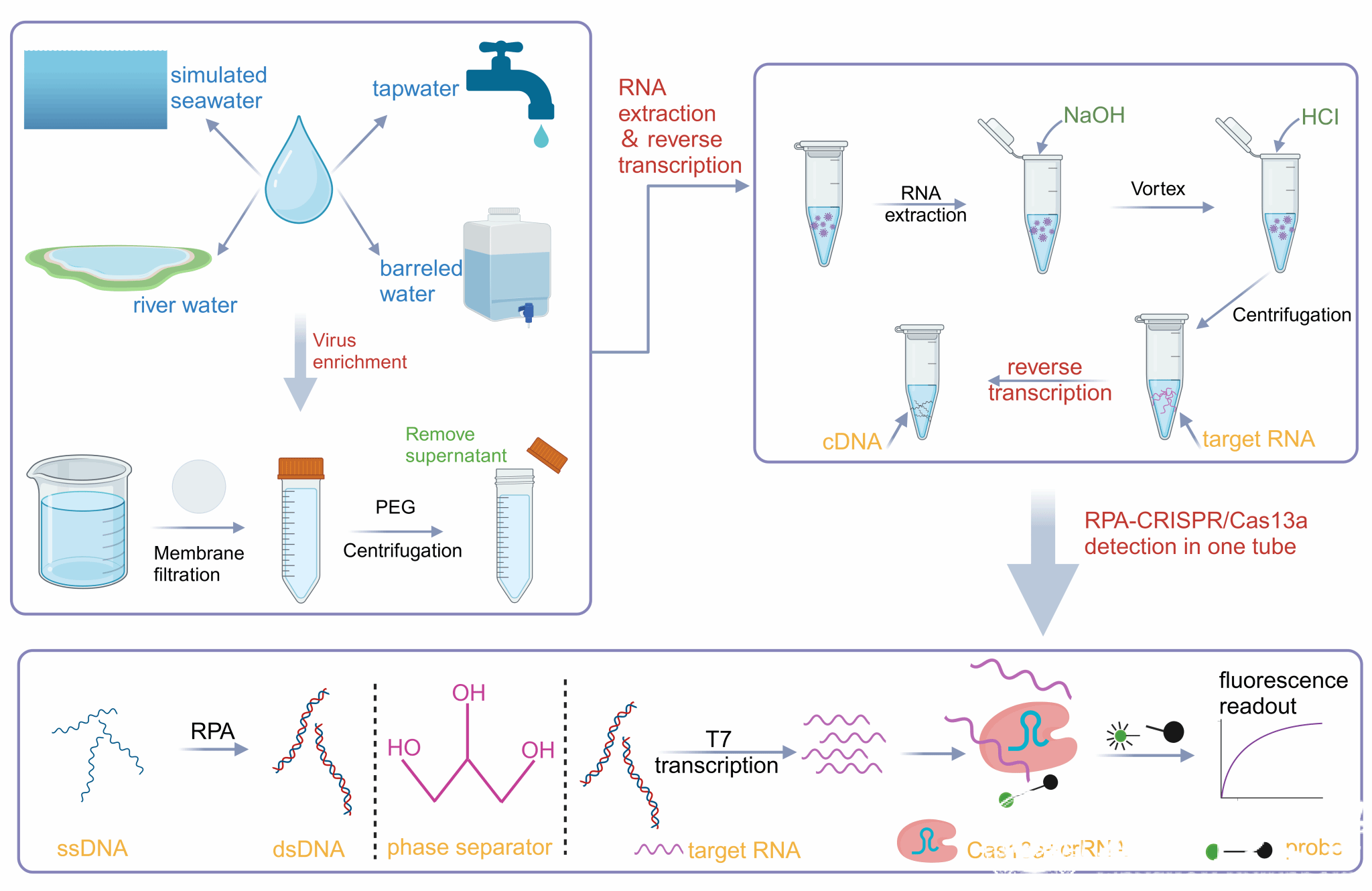 51暗网 生命与环境科学学院吴明江教授团队结合自身优势开展环境毒理和病原检测等交叉研究,取得了系列研究成果。近日,苏来金教授课题组在环境领域著名学术期刊Environmental International杂志上(SCI一区TOP 期刊,IF=10.3)发表了题为“CRISPR/Cas13a combined with reverse transcription and RPA for NoV GⅡ.4 monitoring in water environments”的研究性论文。该论文基于重组酶聚合酶扩增技术(RPA)和CRISPR/Cas13a系统,建立了一种适用于多种水环境、准确可靠、简便快速的GⅡ.4型诺如病毒定量检测方法,该方法在复杂水环境和资源有限地区的诺如病毒快速检测表现出巨大的应用潜力。