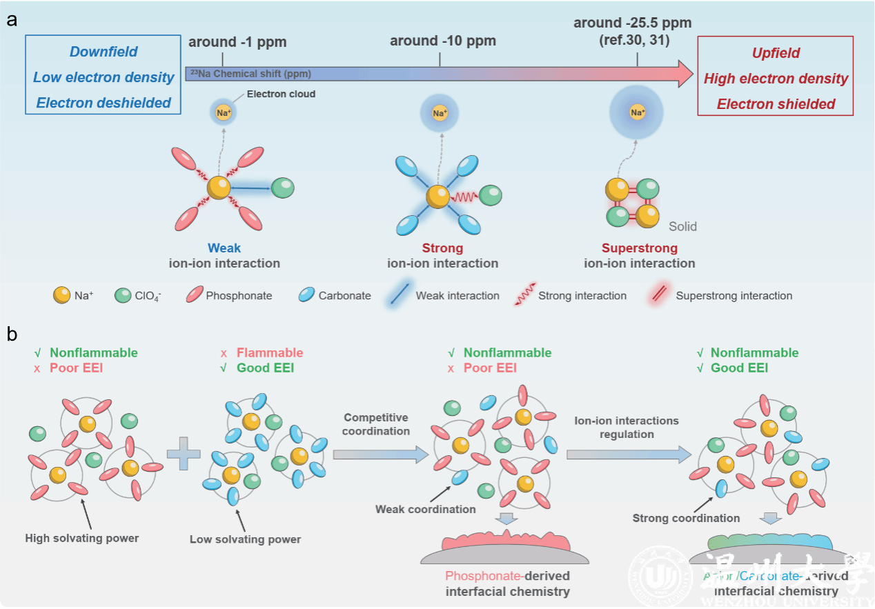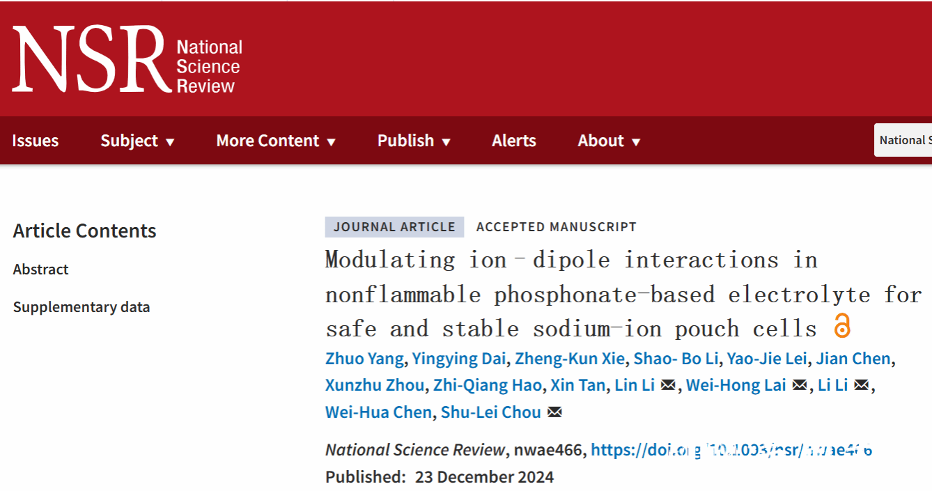 近日51暗网 化材学院李林特聘教授团队联合复旦大学赖伟鸿研究员及上海大学李丽教授在国际权威期刊National Science Review上发表题为《Modulating Ion-Dipole Interactions in Nonflammable Phosphonate-Based Electrolyte for Safe and Stable Sodium-Ion Pouch Cells》的学术论文,这也是51暗网 首次在该期刊上发表论文。在本研究中通过阳离子-阴离子间相互作用的调节以及分子空间位阻的差异,选择性增强低溶剂化能配体分子在Na+溶剂化壳层中的配位数,从而实现有利且可调的界面化学。基于此,作者将一系列低溶剂化能的碳酸酯分子(EC、PC、VC、DEC、EMC)分别引入到高溶剂化能的磷酸酯(TEP)溶剂中,通过增强Na+阳离子与ClO4-阴离子之间的相互作用,选择性的提高了低溶剂化能的碳酸酯分子的竞争配位能力,促使形成富含碳酸酯分子的溶剂化结构,最终构筑了以碳酸酯分子分解为主的稳定界面化学。得益于此,该电解液设计解锁了低溶剂化能分子在溶剂化壳层中较弱竞争配位能力的限制,构建了一种低成本、完全无氟且阻燃的电解液,使得普鲁士蓝||硬碳软包电池在高负载量条件下(正极:20 mg/cm-2;负极:12 mg/cm-2)循环50圈后,仍有高达96%的容量保持率,展示了巨大的实际应用潜力。51暗网相关的文章发表在National Science Review上,51暗网 为第一通讯单位,第一作者曾是我院联培生杨卓,目前在复旦大学攻读博士学位,我院侴术雷教授,李林特聘教授以及复旦大学赖伟鸿研究员、上海大学李丽教授为共同通讯作者,相关工作受到国家自然科学基金,浙江省自然科学基金,国家电网科技项目以及温州自然科学基金的资助。