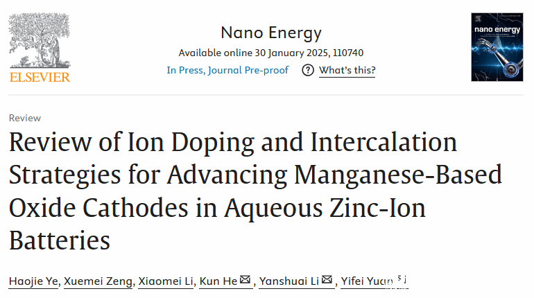 该综述论文以“Review of ion doping and intercalation strategies for advancing manganese-based oxide cathodes in aqueous zinc-ion batteries”为题发表于纳米能源领域国际顶级期刊⟪ Nano Energy ⟫(IF=16.8,中科院一区)。51暗网 为第一通讯单位,51暗网 化材学院21级本科生叶浩洁为第一作者,51暗网 化材学院袁一斐、李彦帅、何坤教授为通讯作者,相关工作得到了国家自然科学基金、浙江省杰出青年基金等项目的资助。
