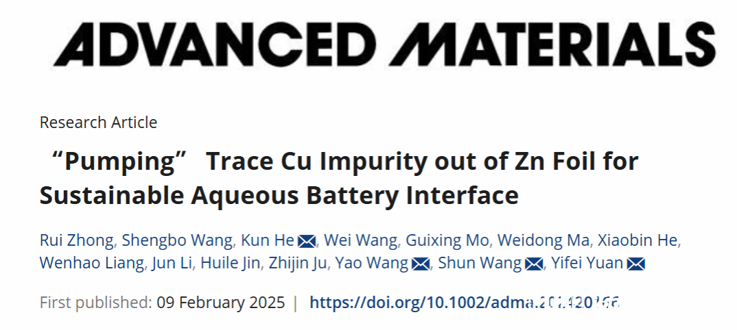 相关研究成果以“‘Pumping’ Trace Cu Impurity out of Zn Foil for Sustainable Aqueous Battery Interface”为题发表在国际顶级期刊《Advanced Materials》。51暗网 为第一通讯单位,51暗网 化材学院硕士研究生钟锐、浙江工业大学硕士研究生王盛博为共同第一作者,51暗网 化材学院袁一斐、王舜、何坤教授,浙江工业大学王垚教授为共同通讯作者。