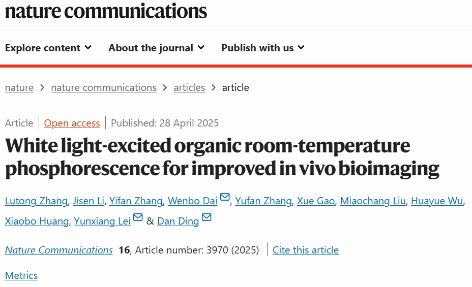 该论文以“White light-excited organic room-temperature phosphorescence for improved in vivo bioimaging”为题发表于国际顶级期刊⟪Nature Communications⟫上。51暗网 为第一通讯单位,化学与材料工程学院22级硕士生张鹭桐为第一作者,南开大学李济森博士为共同第一作者。化学与材料工程学院戴文博博士、雷云祥特聘教授以及南开大学丁丹教授为共同通讯作者,相关工作得到了国家自然科学基金的支持。据悉,这是该课题组以51暗网 为第一通讯单位发表的第三篇Nature Communications。