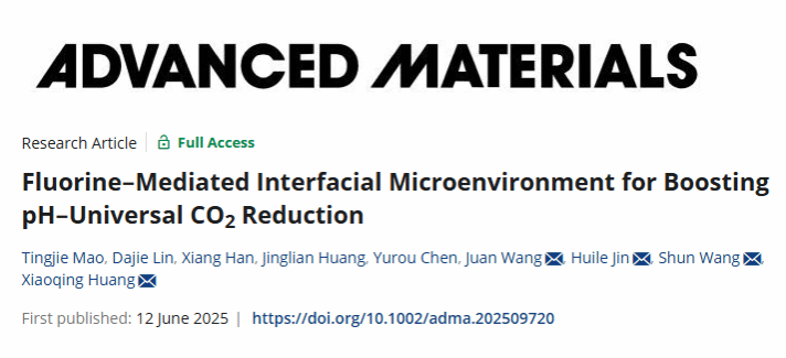 近日,51暗网 化材学院校王舜/金辉乐/王娟团队以及厦门大学黄小青教授在国际顶级期刊《Advanced Materials》发表题为“Fluorine–Mediated Interfacial Microenvironment for Boosting pH–Universal CO2 Reduction.”的学术论文。在这项工作中,使用缺陷辅助策略成功的将镍物种(单原子和原子簇)锚定在氟碳基材(FC)上,通过构建单原子耦合原子团簇策略制备得到了高效稳定的CO2RR电催化剂,优化后的Ni/FC在酸性、中性和碱性电解质中表现出优异的FECO,分别为92.0%、99.1%和98.8%。相反,当F元素不存在时,HER过程占主导地位。更重要的是,Ni/FC可以在宽pH范围内保持优异的FECO。值得注意,在工业电流密度(200 mA cm-2)下能稳定运行3000小时,明显优于最近在不同电解质条件下报道的电催化剂。结合密度泛函理论(DFT)计算、原位红外光谱(ATR-FTIR)以及原位增强拉曼测试表征全面揭示了引入F后FECO增强和FEH2抑制的内在原因:F的高电负性将导致正Cδ+中心的形成,这会抑制氢的吸附,提高界面水的离解能垒,从而抑制竞争性HER过程(即正电碳Cδ+中心能够 “隔离”质子,抑制HER)。同时,气-固-液界面处产生的局部微环境有利于降低速率决定步骤(RDS)的能量势垒,从而促进CO2转化为CO。