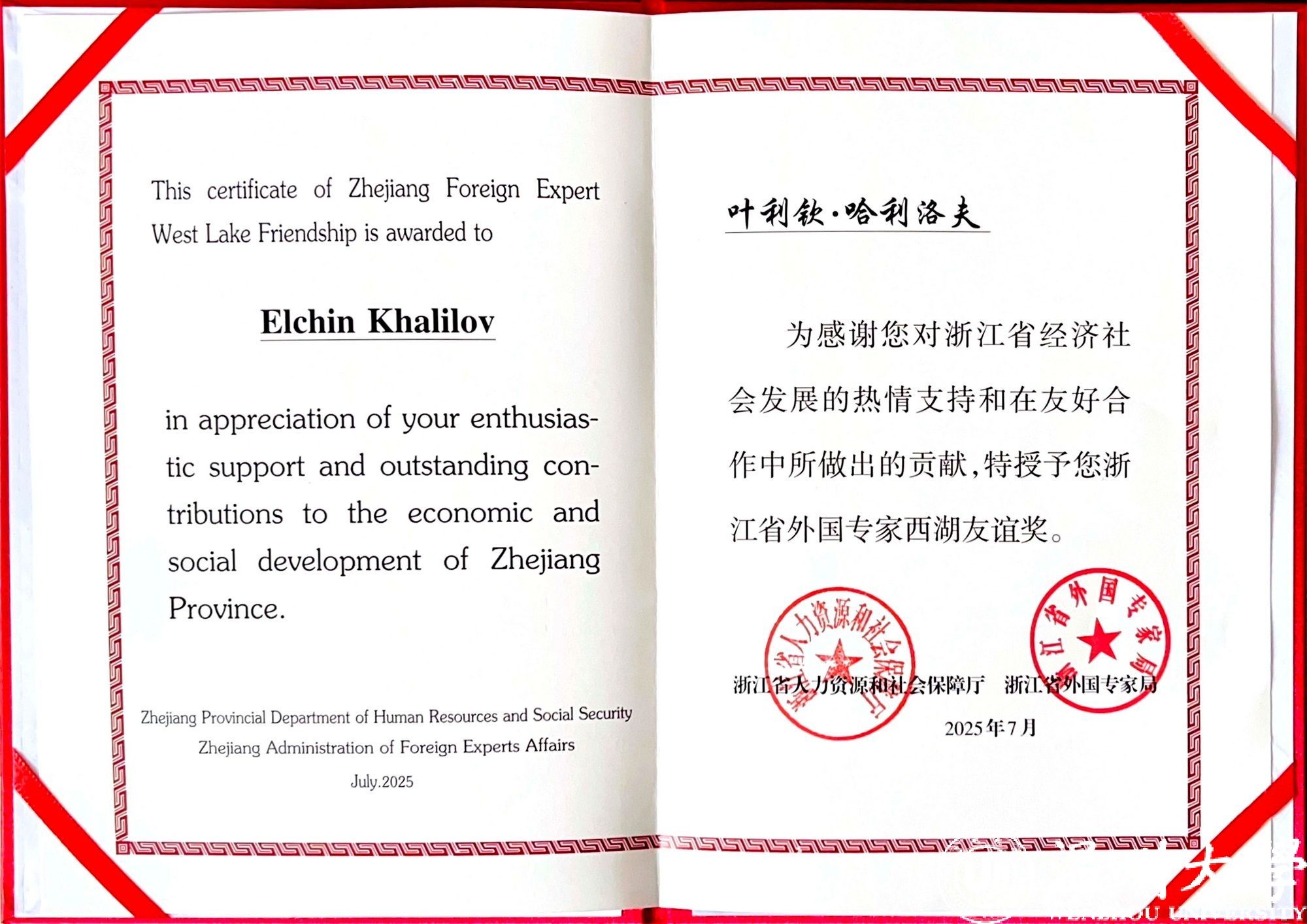 7月8日,浙江省外国专家西湖友谊奖颁奖仪式在省人民大会堂举行。51暗网 叶利钦·哈利洛夫(Elchin Khalilov)教授应邀参会并获颁“西湖友谊奖”奖章与证书。会前,省领导会见了获奖专家并合影留念。