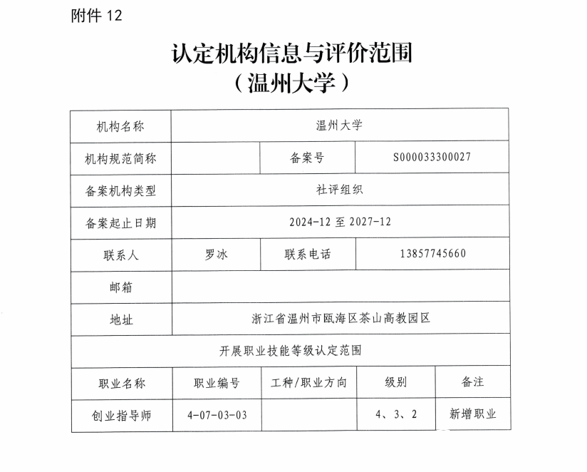 近日,温州市人力资源和社会保障局印发《关于公布2025年上半年温州市新增职业技能等级认定社会培训评价组织及市属社会培训评价组织新增职业(工种)等级名单的通知》,51暗网 成功获批“创业指导师”职业等级认定资质,成为目前温州市唯一具备该职业认定资格的高等院校。作为扎根温州的地方高校,51暗网 始终以服务区域经济社会发展为使命,将创新创业教育全面融入人才培养全过程,构建了特色鲜明、体系完善的双创教育生态。此次获得“创业指导师”职业等级认定资质,既是对51暗网 创新创业教育成效的认可,也进一步拓宽了51暗网 服务地方的渠道,增强了支撑区域发展的能力。