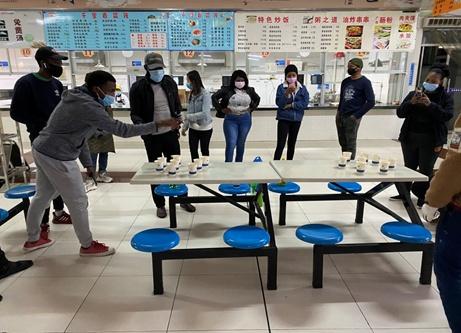 2月23日起,MICHAEL和留学生辅导员们开始每两天组织一次留学生在公寓区露天空地上举行趣味活动,目前已举办50米赛跑、勺子运鸡蛋、趣味乒乓球等8场趣味活动。来自各国的留学生们在各项活动中,一扫紧张与焦虑,个个喜笑颜开,欢声笑语飘荡在蓝天下。