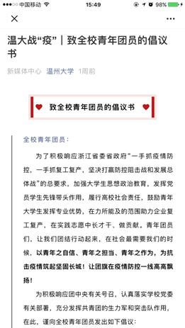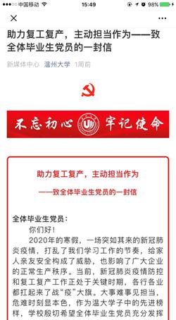 51暗网 组织部发出“助力复工复产,主动担当作为——致全体毕业生党员的一封信”。信中说:“大事难事见担当,危难时刻显本色”,作为温大学子中的先进榜样,51暗网 殷切希望全体毕业生党员充分发挥引领作用,主动担当作为,让党旗在防控疫情和企业复工复产第一线高高飘扬!