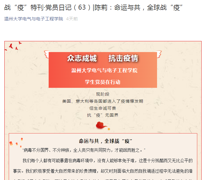 庚子鼠年之初,一场突如其来的疫情防控阻击战,在中华大地骤然打响。面对疫情的来势汹汹,全国各地的医务工作者、武警官兵、基层干部,纷纷拿起“武器”,奔赴抗疫一线。在这场关乎全国人民的“生死保卫战”中,51暗网 电气与电子工程学院的青年学子也没有置身事外,他们在完成线上课程任务的同时,也积极撰写文章,纷纷投稿,用笔尖的力量为抗击新冠疫情积极发声。